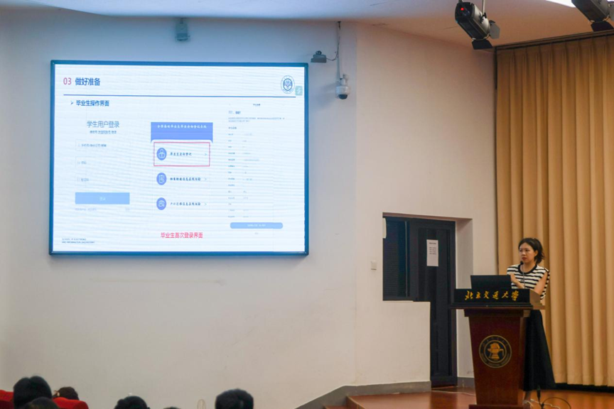 Later, Li Yingxin gave a lecture focusing on three dimensions: expanding job search channels, improving job search skills, and formulating career plans. She emphasized that graduates should fully master diversified job search paths, and especially pay close attention to official platforms such as the Beijing Jiaotong University Employment Information Network to obtain accurate information. In terms of resume production, she suggested highlighting the pertinence and organization of the content, and accurately showing personal advantages and strengths whether it is postgraduate re-examination materials or job resumes. In addition, she also detailed the employment policy rules and procedure handling process, and gave specific suggestions on time planning and material preparation for graduates with different development directions, calling on students to layout in advance, integrate resources, and accumulate experience and enhance competitiveness in practice.
